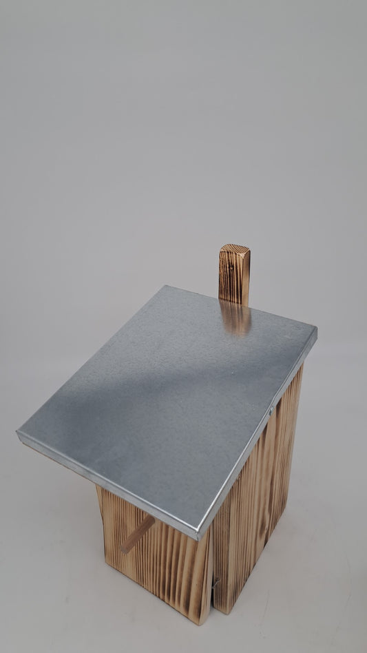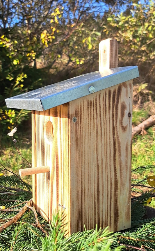 Nistkasten Nisthöhle für Vögel Vogelhaus Nistkasten zum Aufhängen Bruthöhle mit Blechdach mit Einflugloch 45mm edel geflammt (N1G)